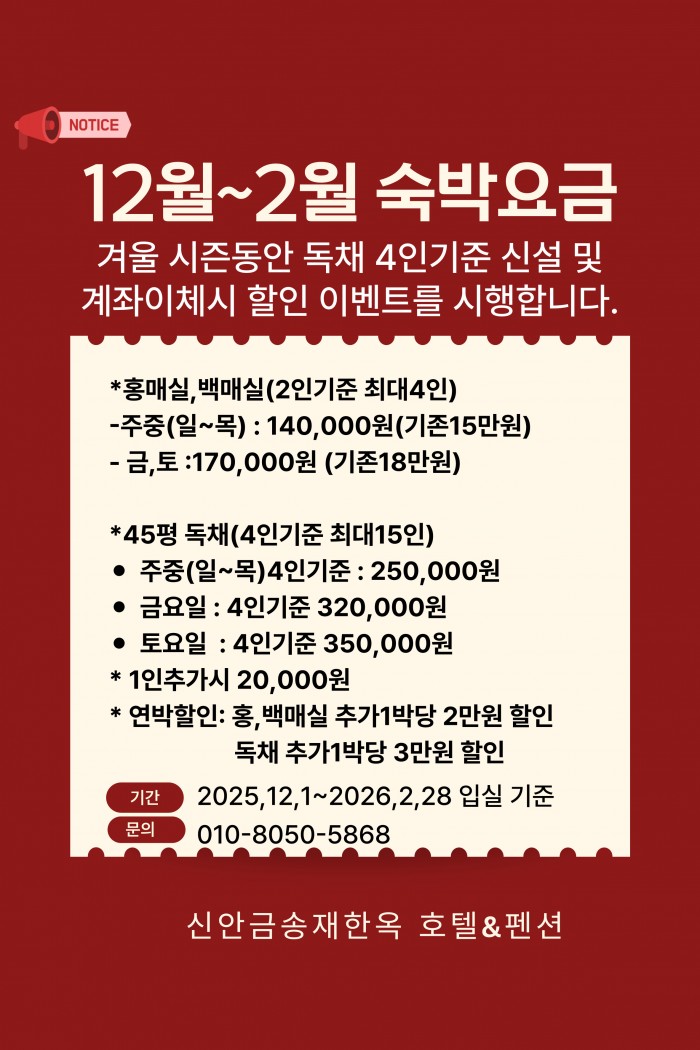 신안금송재한옥호텔 홈페이지(이하‘회사’)는 고객님의 개인정보를 중요시하며, '정보통신망 이용촉진 및 정보보호'에 관한 법률을 준수하고 있습니다.